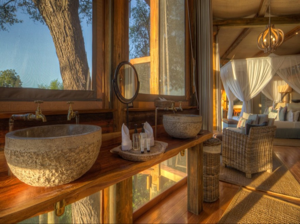 Camp Okavango offers some of the most beautiful and elegant Okavango accommodation available in this pristine region of the Delta, dominated by permanent channels and shallow floodplains, making activities primarily water focused. There is no vehicle traffic to disturb the peace, from traditional mokoro rides to safari boats, bush walks, optional helicopter rides and fishing (strictly catch and release). Hidden amongst beautiful ancient mangosteen trees, the main area comprises a network of interconnected walkways and decks linking two lounge areas, a dining room, a curio shop, small library area and self-service bar. Another wooden walkway leads to a very cool infinity pool right on the edge of the swamp, with plenty of comfortable sun-loungers under a shade-giving thatched lapa. For the suites, these elegantly designed havens are constructed from natural timber blending subtly into the surrounding woodlands, with glass doors that fold away in front of both the bed and a separate lounge area, creating an open space, extending out onto the private deck, which offers uninterrupted views of the natural surrounds.
